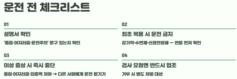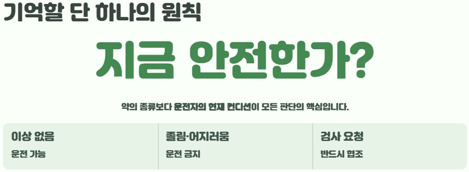 가장 중요한 기준은 하나입니다. 정상적인 운전이 가능한 상태인가입니다. 이 기준 하나로 대부분의 상황이 정리됩니다. 졸림이 느껴지거나 반응 속도가 느려졌거나 집중력이 떨어졌다면 당연히 운전은 피하는 것이 안전합니다. 특히 약 복용 후에는 평소보다 더 신중하게 상태를 확인해야 합니다. 결국 약 자체보다 운전자의 컨디션이 모든 판단의 핵심입니다.