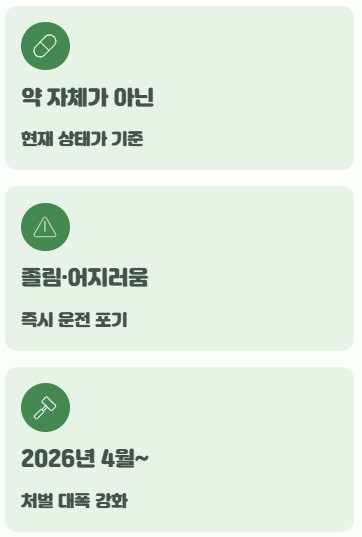 2026년부터 강화된 약물 운전 처벌 기준에 따라 감기약 운전의 위험성을 명확히 이해하는 것이 중요합니다. 단순히 약 복용 여부보다 운전자의 정상적인 운전 능력 유무가 핵심 판단 기준이 됩니