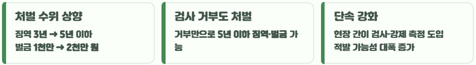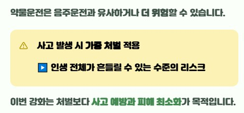 최근에는 약물 운전에 대한 기준이 더 명확해지고 처벌이 전반적으로 강화되었습니다. 핵심은 단속 확대와 처벌 기준 구체화입니다. 주요 변화는 다음과 같습니다.