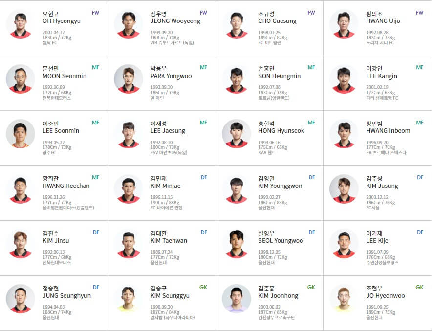 각 포지션별 전체 선수 명단 및 개인 프로필은 아래를 통해 확인할 수 있습니다.