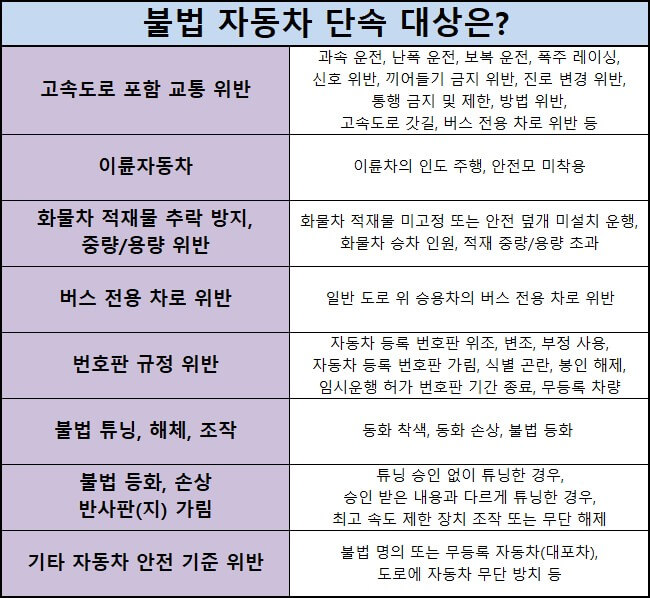 10월 16일부터 한 달 동안 실시하는 불법 자동차 일제 단속 대상은 승용차, 화물차는 물론 이륜차에도 해당됩니다. 도로교통법 위반은 기본이고, 번호판 가림, 헤드 라이트 개조, 차박을 위한 개조, 광폭 타이어, 속도 제한 장치 무단 해제, 화물차의 판스프링 불법부착 및 반사판(지) 불량 등이 있습니다. 아래 표에 보기 쉽게 정리했으니, 참고해 주세요.